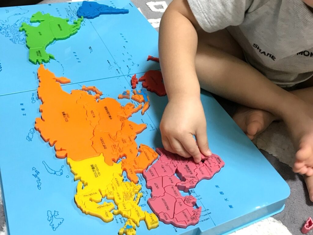 KUMON日本地図パズルの次なるステップに同シリーズの世界地図パズルを与えました。日本地図と違って、大きな国から小さな国までバラバラなサイズ感と、ピース数が増えます。当時3歳になる前の長男ロープは、想像以上の喰いつきで繰り返し遊んでいました。